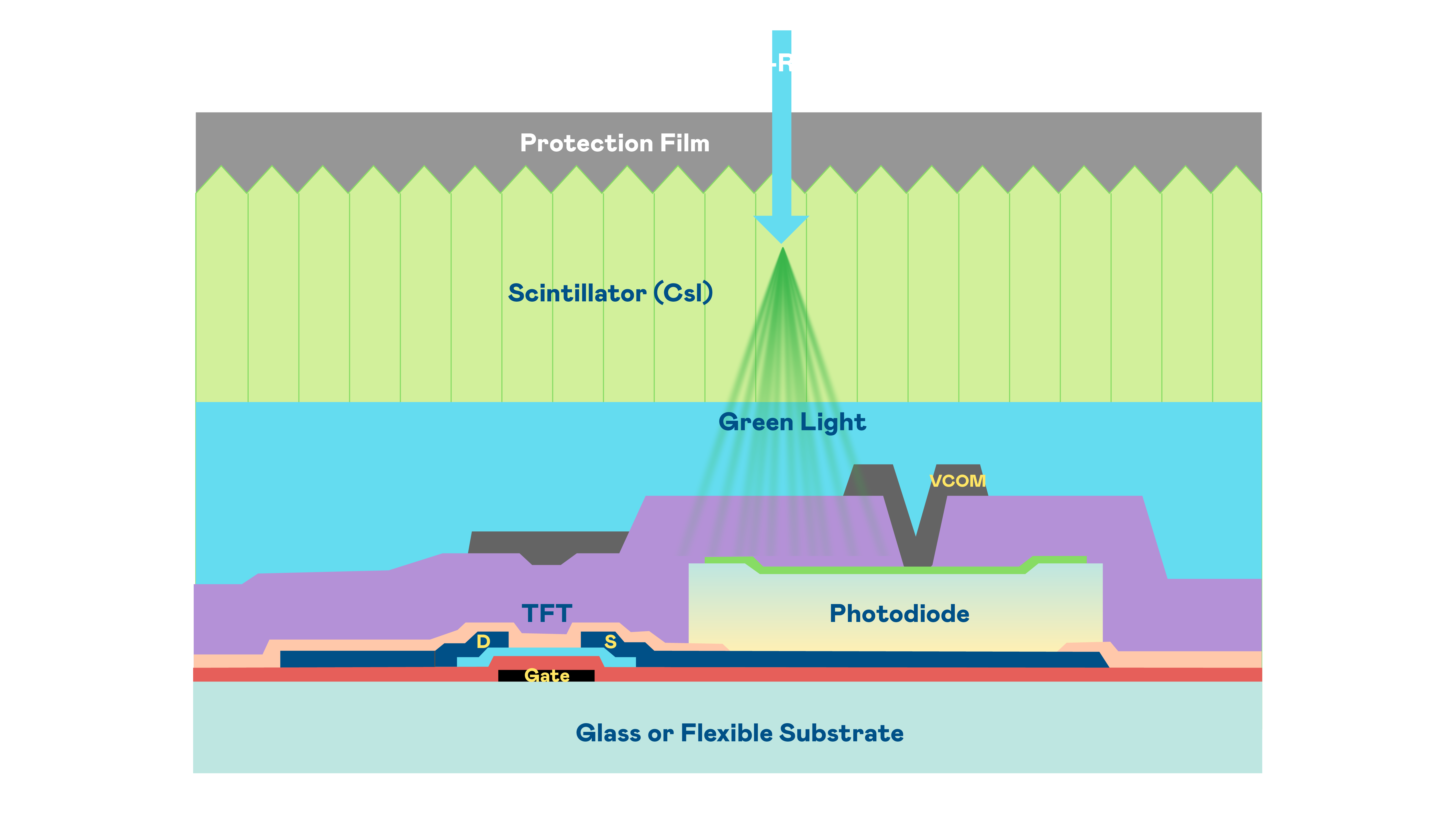 EVO真人的X光影像感測陣列使用薄膜電晶體 (TFT) 作為每個像素的讀取開關,搭配光電二極體(Photodiode)的光電轉換元件,用以感測X光影像訊號。
